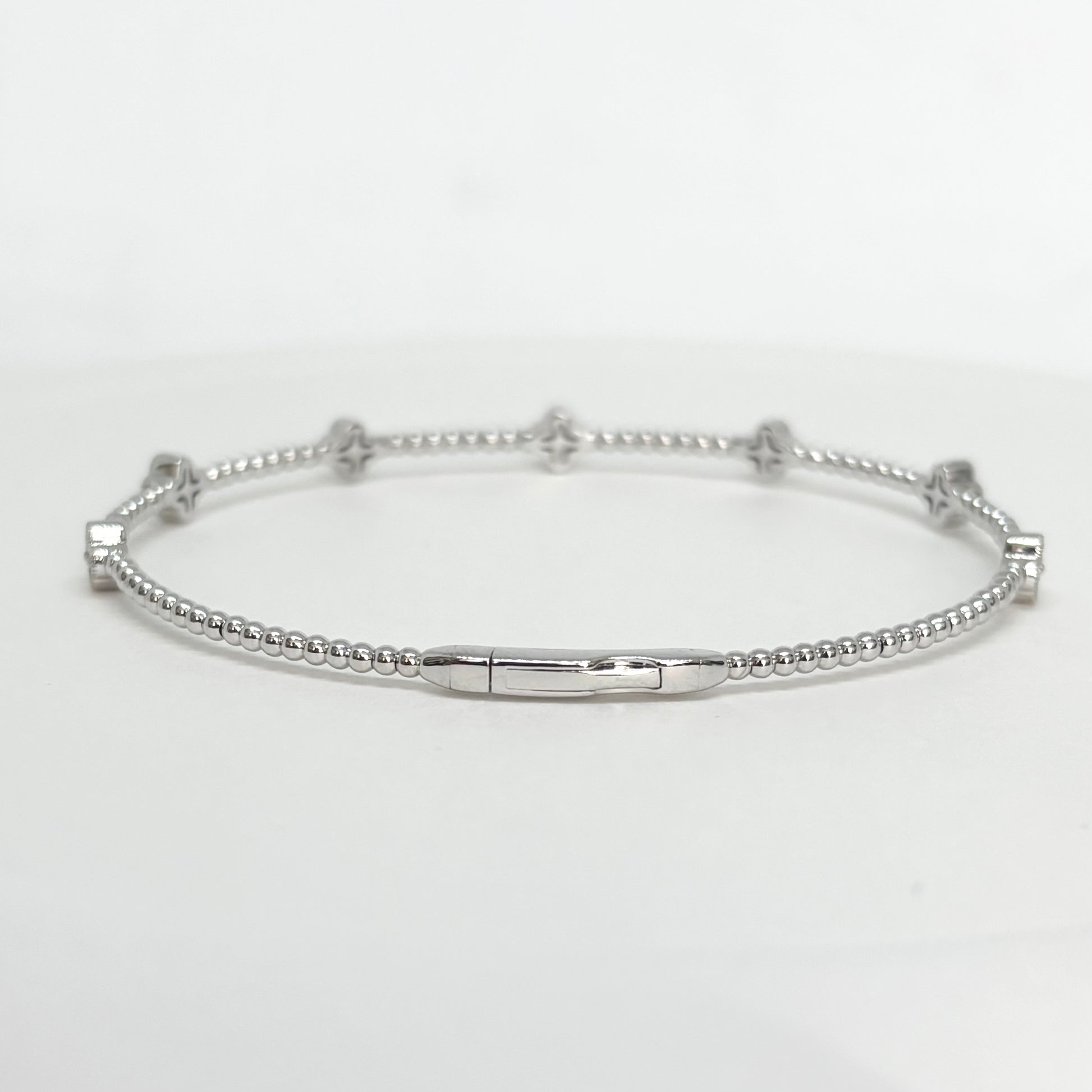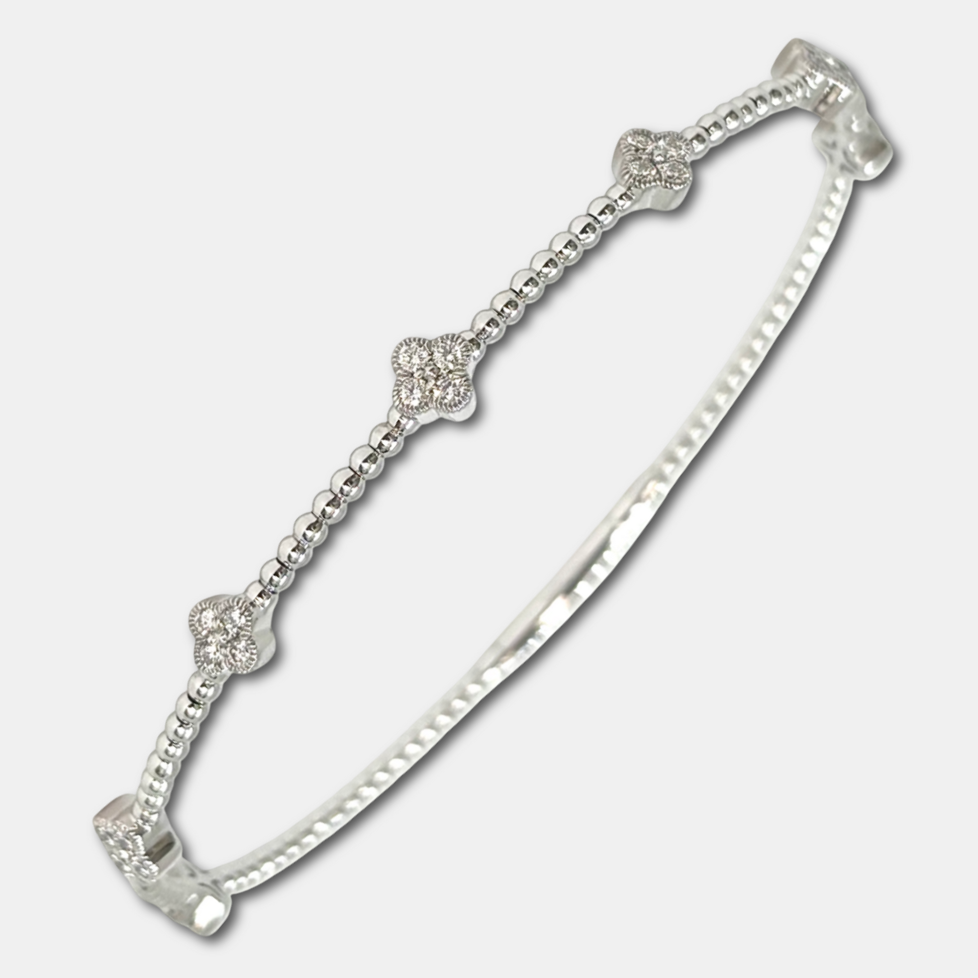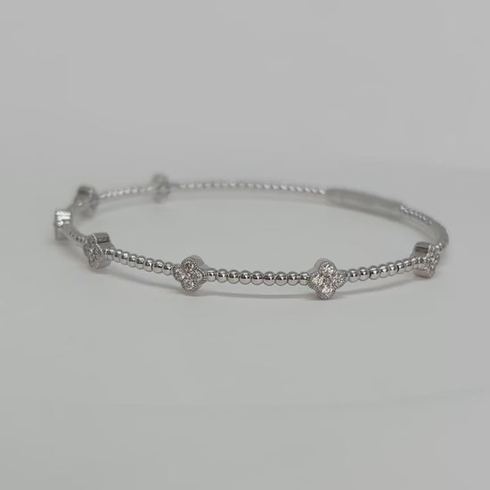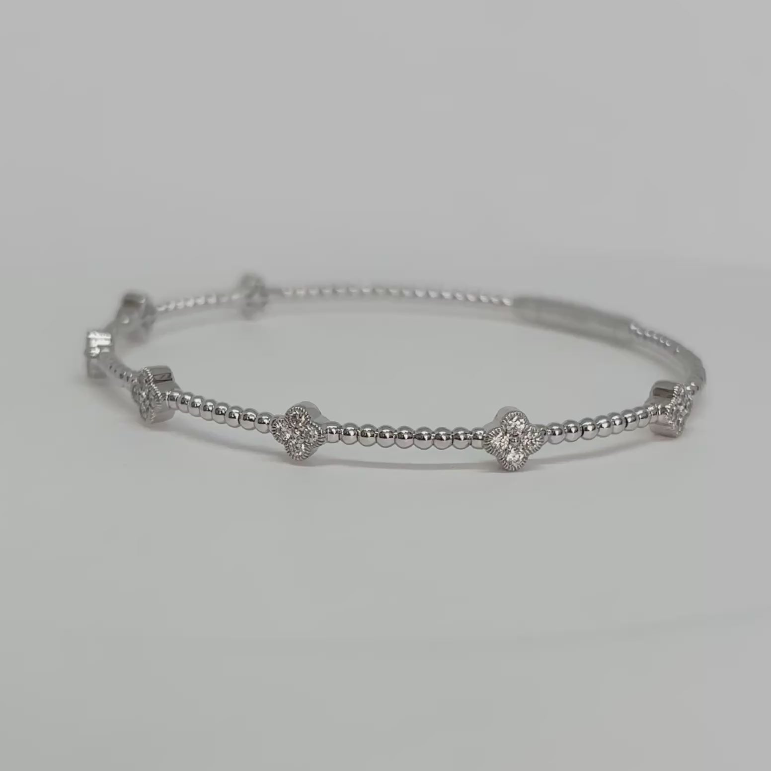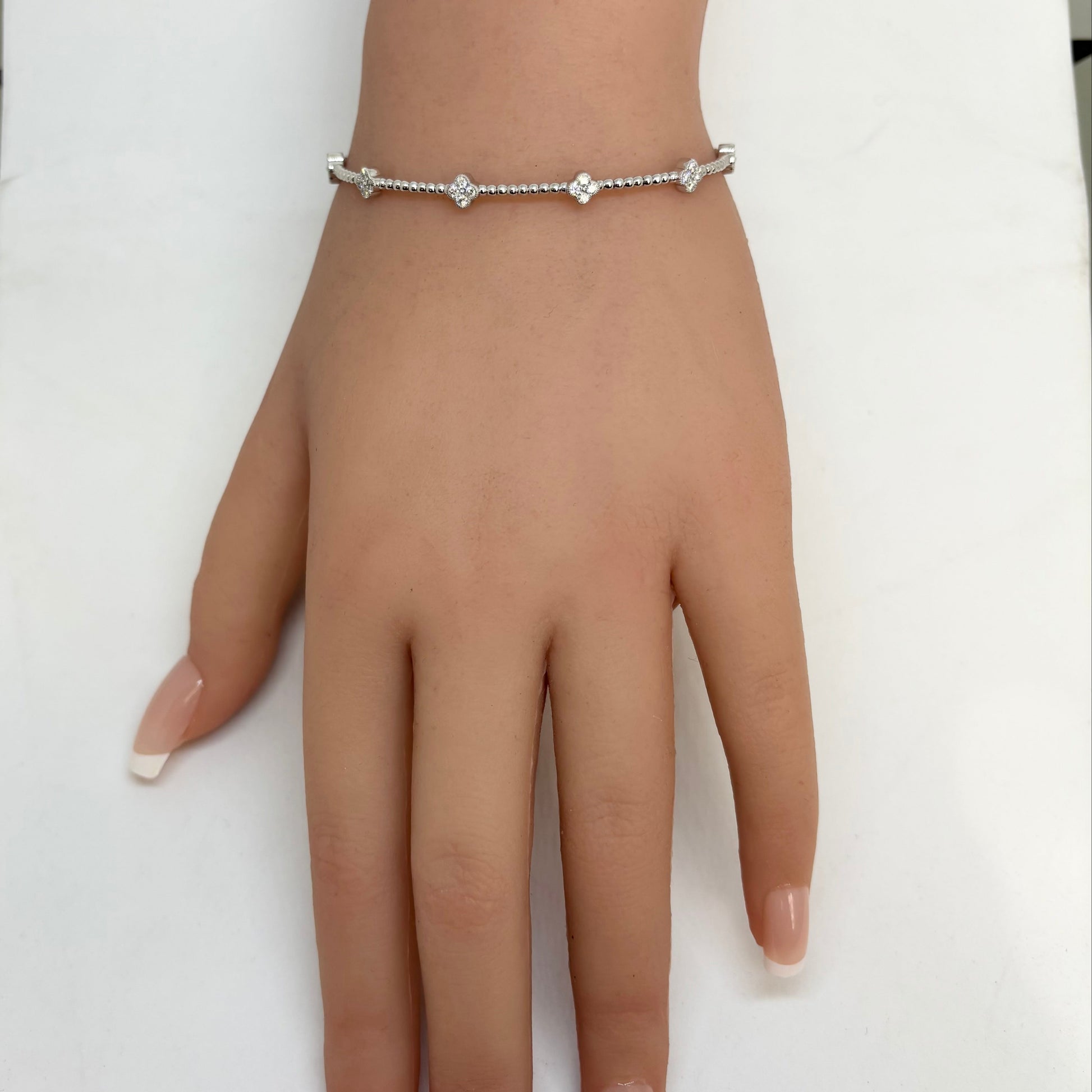 Handcrafted from 14k white gold, this bracelet features beads that create a smooth, continuous texture that feels pleasant to the touch and adds a subtle visual rhythm to the design. At evenly spaced intervals around the bracelet, there are small, decorative settings that hold clusters of diamonds. Each setting features a group of four diamonds arranged in a clover-like pattern.