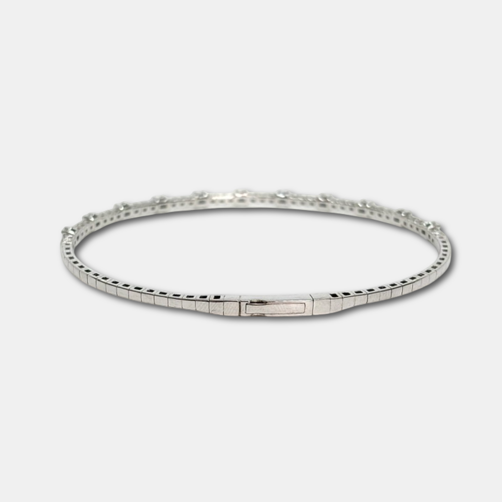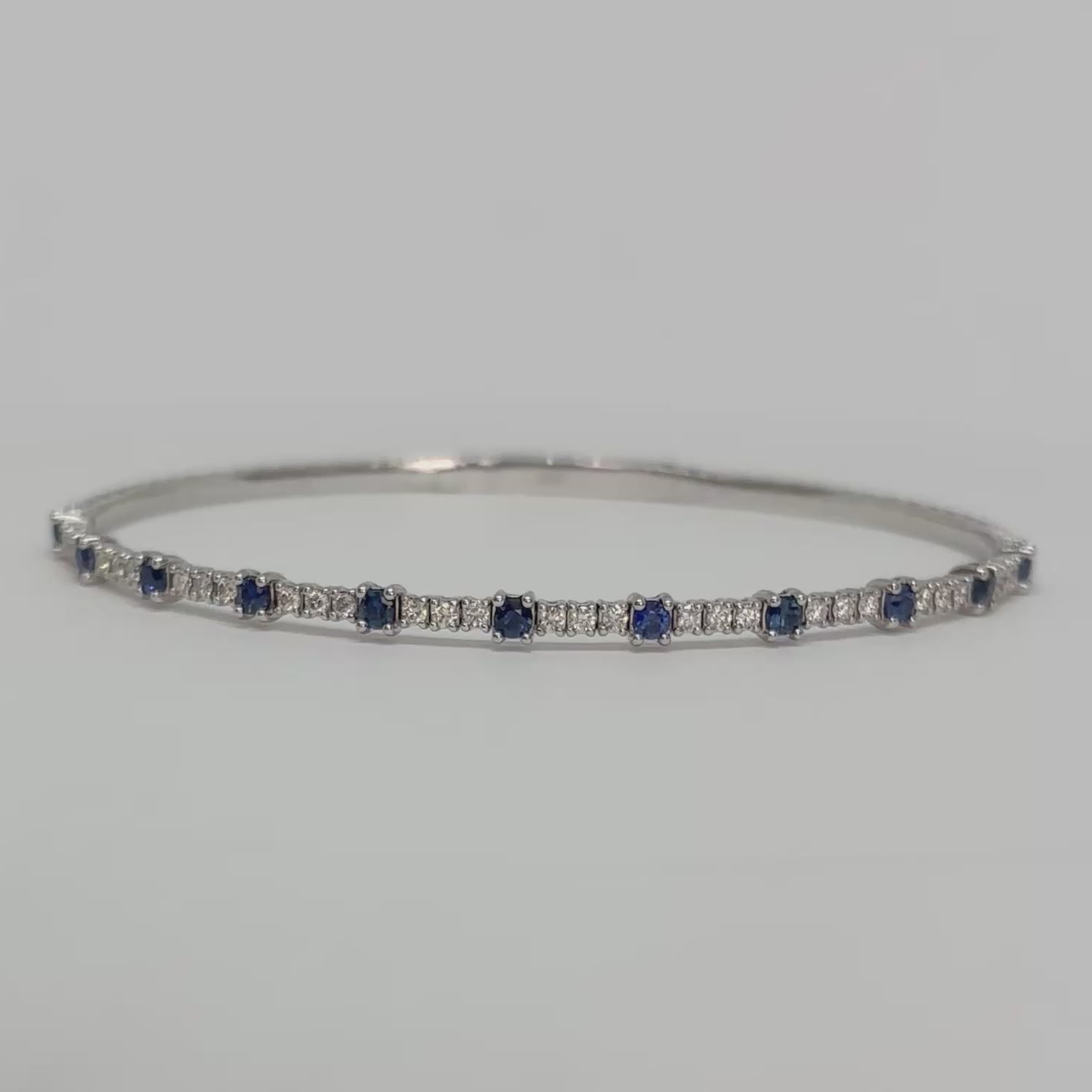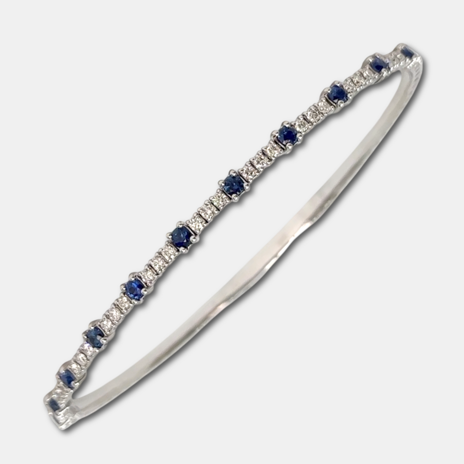 This exquisite bracelet features a delicate yet striking design, crafted from high-quality white gold that provides a sleek, lustrous backdrop. It is adorned with a series of alternating round-cut diamonds and deep blue sapphires, set in a prong setting that highlights the brilliance of the diamonds and the rich color of the sapphires. The stones are evenly spaced along the top half of the open-ended bangle, which allows for a comfortable, adjustable fit on the wrist, making it both elegant and practical. The combination of the sparkling diamonds and vibrant sapphires creates a harmonious contrast against the white gold, resulting in a luxurious piece that exudes sophistication and is perfect for elevating any occasion or serving as a cherished everyday accessory.