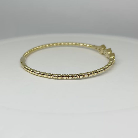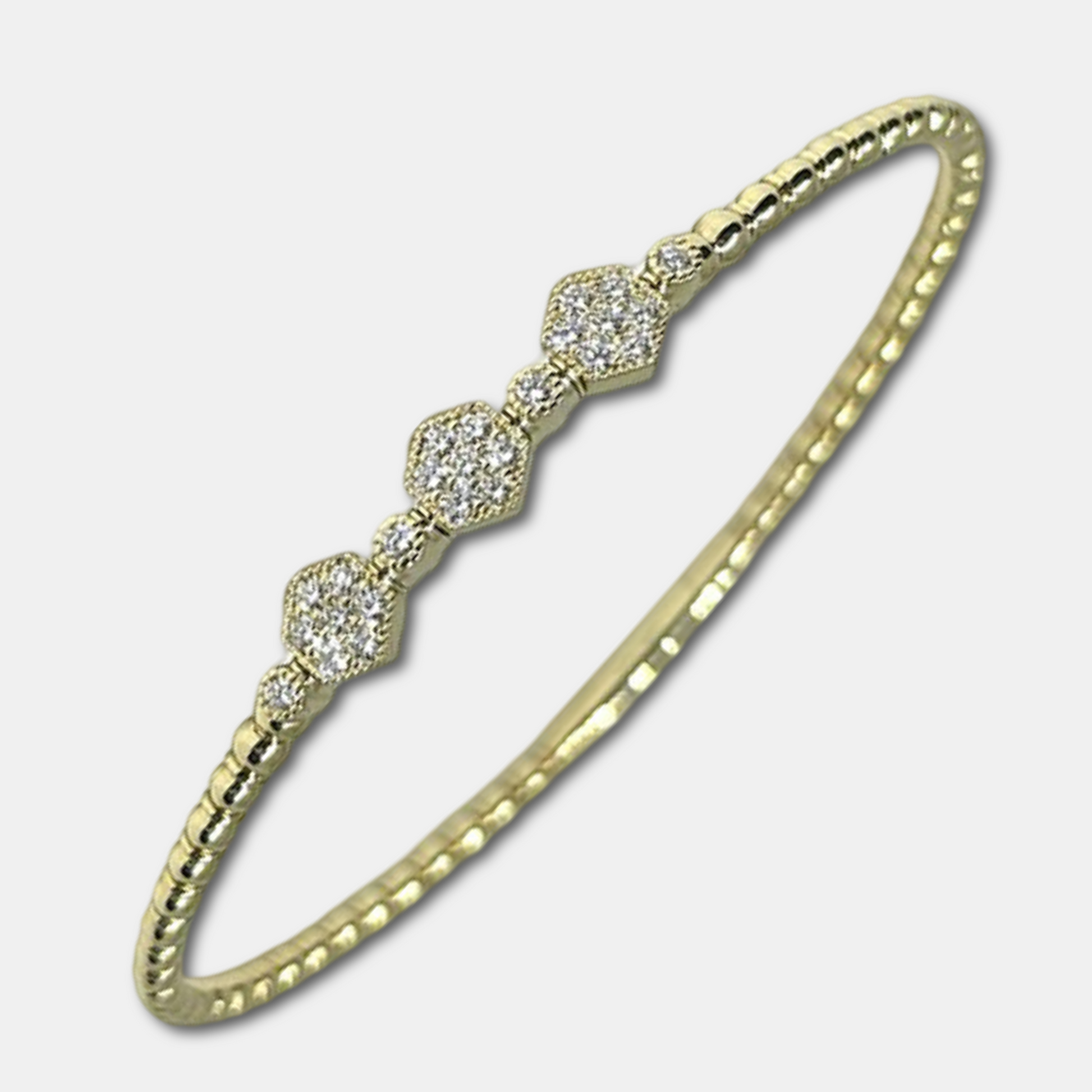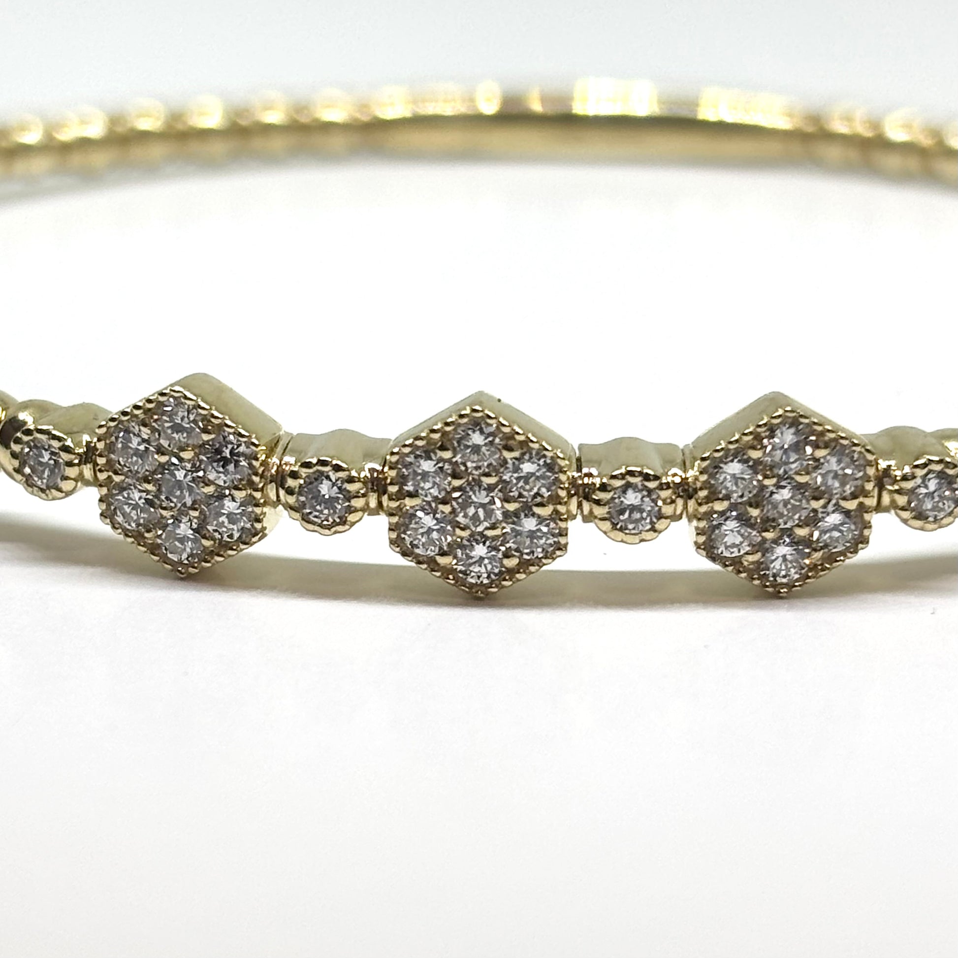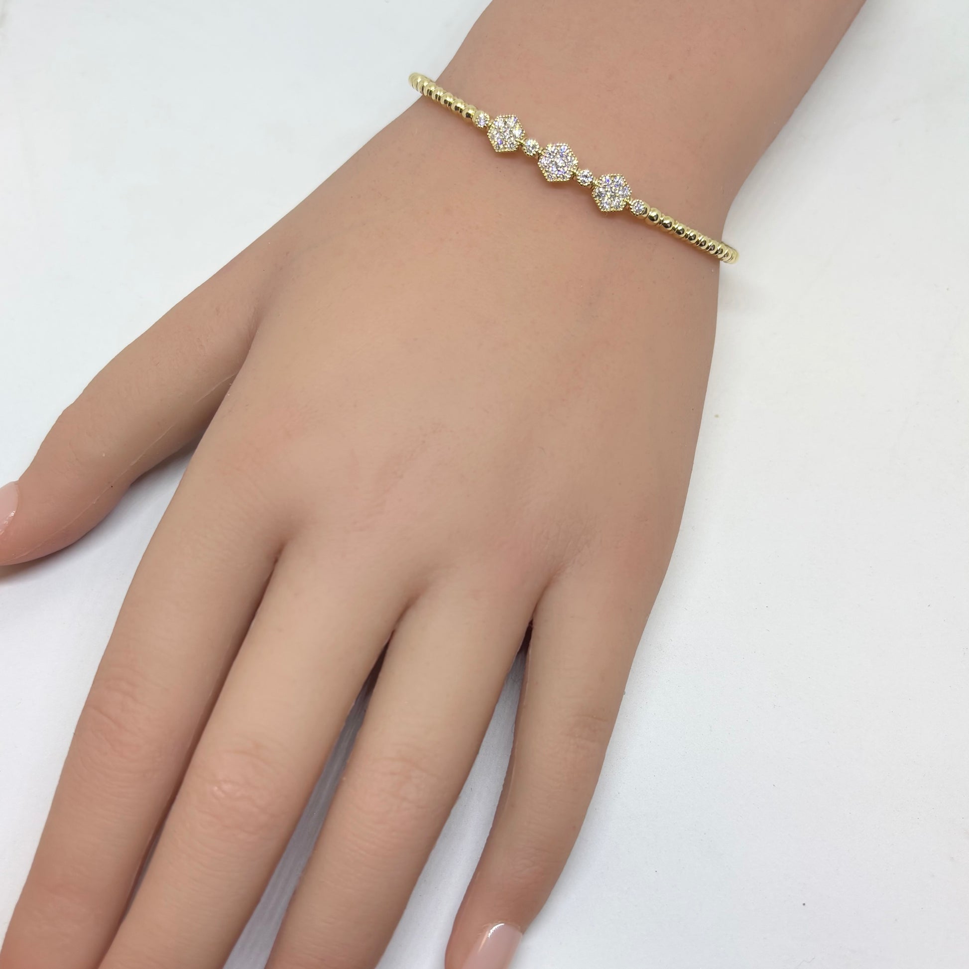 This elegant 0.55 Ct. handmade flexible diamond bangle bracelet is a stunning piece of jewelry, crafted with meticulous attention to detail. At the center, there are three hexagonal settings, each encrusted with sparkling diamonds. These diamonds, totaling 0.55 carats, are meticulously arranged to catch the light beautifully, creating a dazzling effect. The hexagonal shape of the settings adds a modern, geometric flair, contrasting elegantly with the rounded beads of the band.