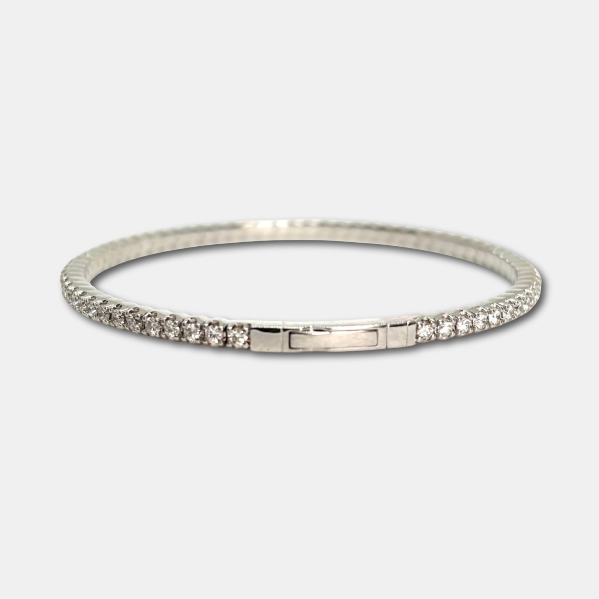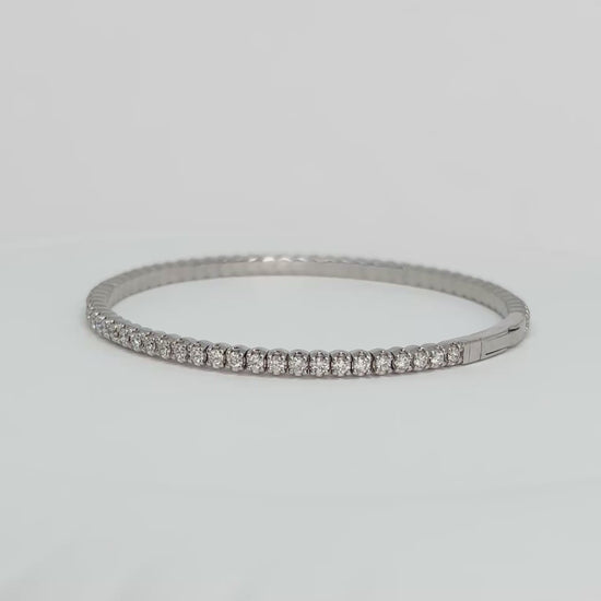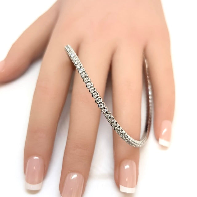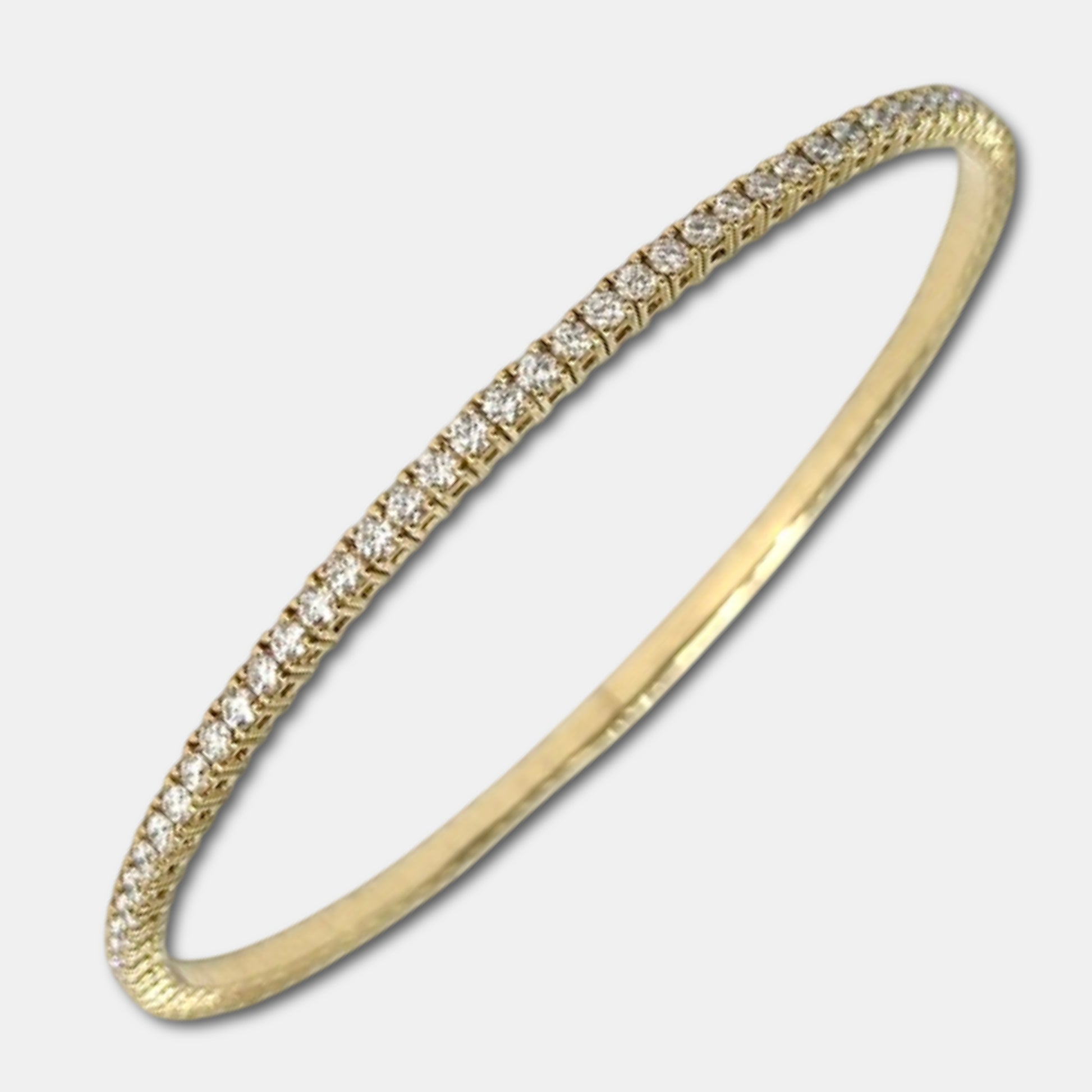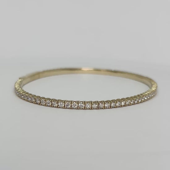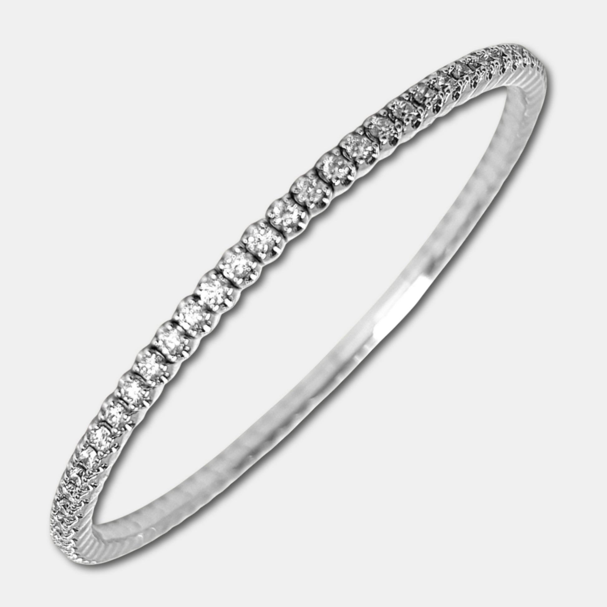 This classic diamond bangle is encrusted with a continuous row of round-cut diamonds, set closely together in a prong setting that spans almost the entire circumference, creating a seamless band of sparkling brilliance. The diamonds are uniformly sized, reflecting light beautifully and adding a touch of timeless elegance to the piece. Ideal for both special occasions and everyday wear, this bracelet exudes understated sophistication and versatility, making it a perfect addition to any jewelry collection.