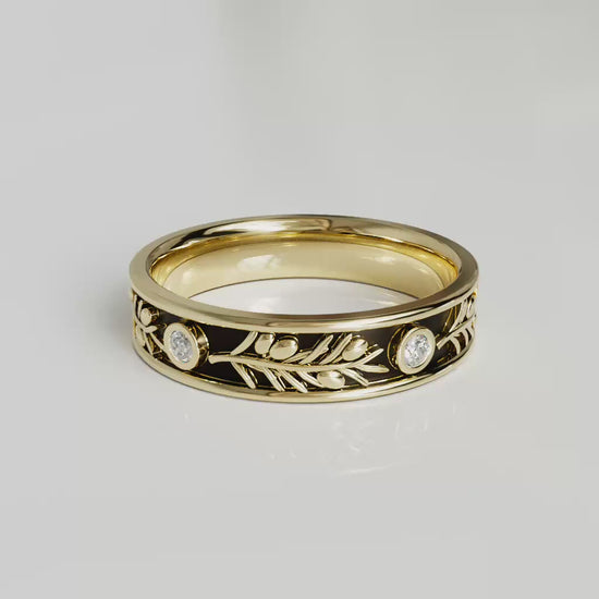 Introducing OLIVIA. Embodying the essence of luxury and elegance, Olivia is a beautifully symbolic and nature-inspired piece. Adorned with a delicate olive branch that wraps gracefully around the band, representing peace and harmony. Nestled among the flowing branches are natural diamonds, each one set in polished bezels.This exquisite piece is a timeless statement of eternal love and beauty.