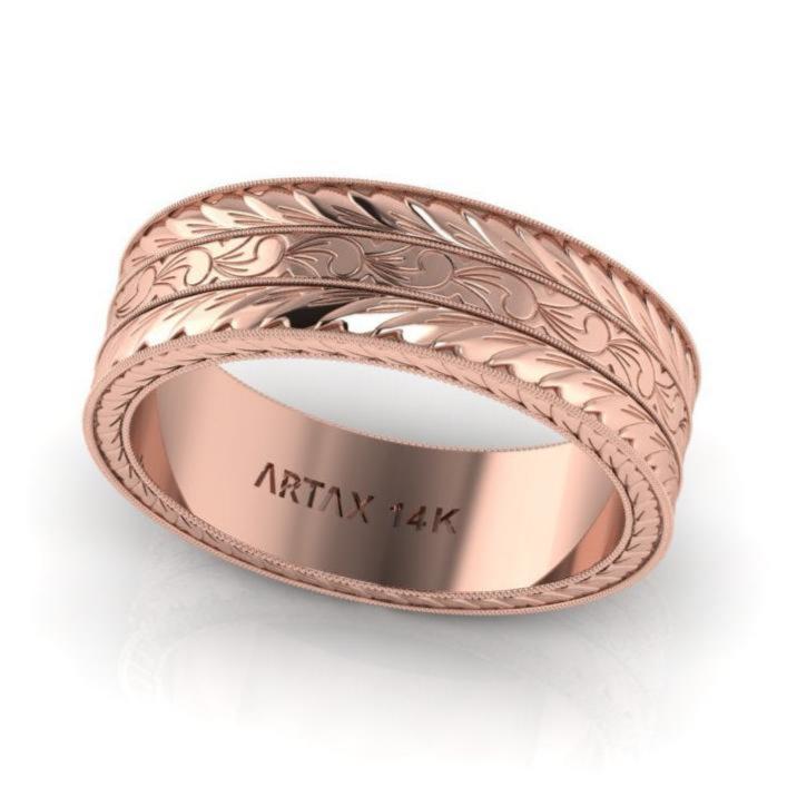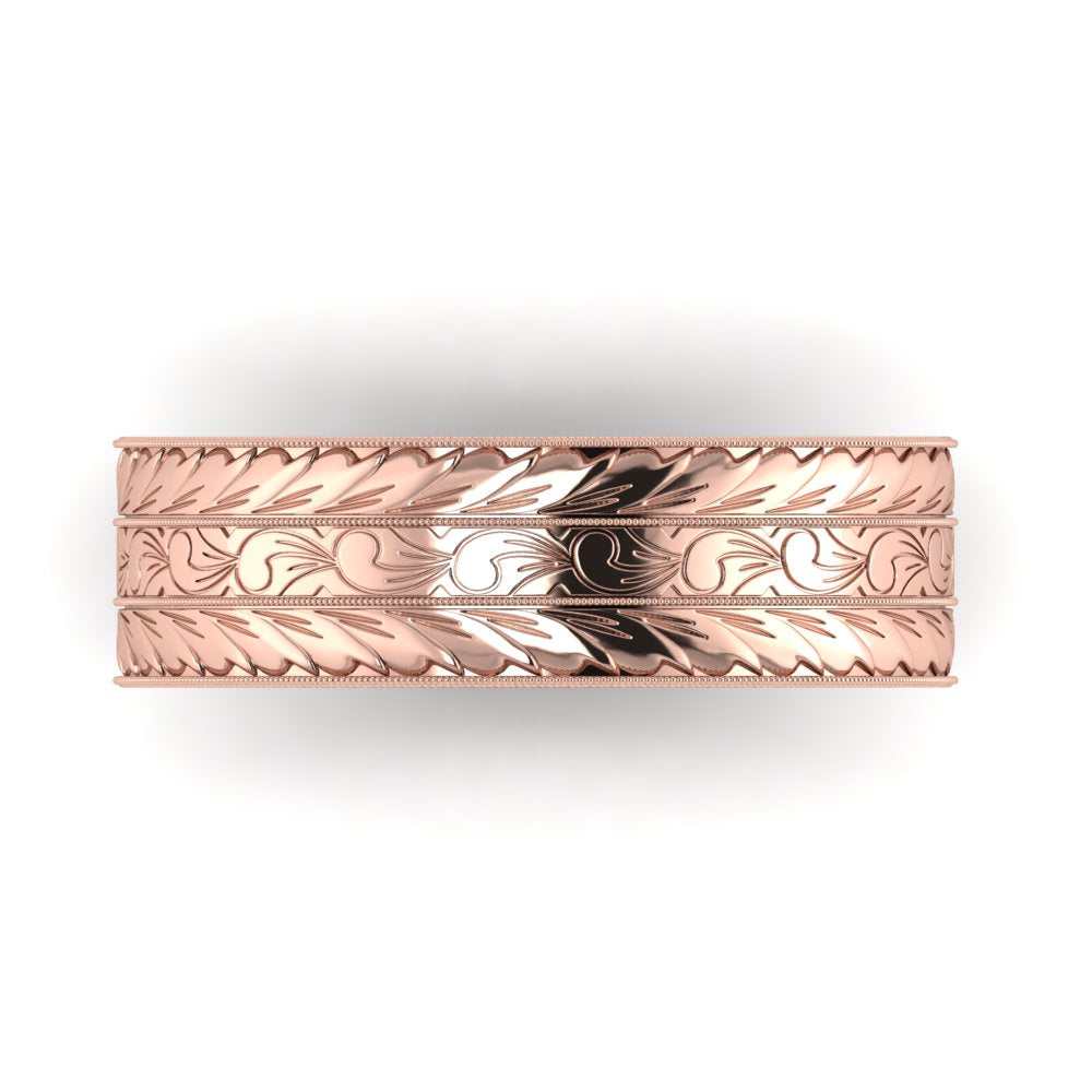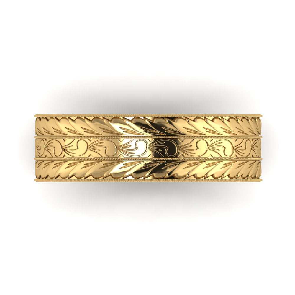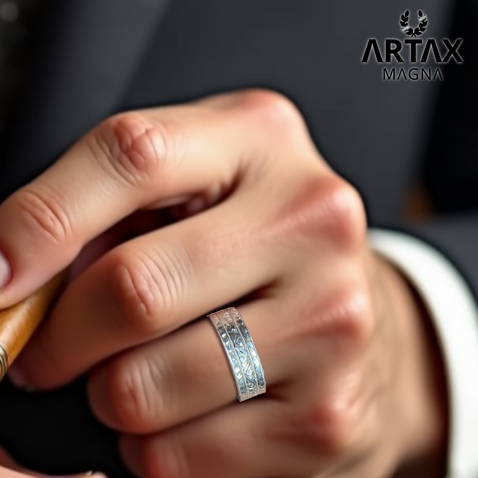 The MΛGNΛ ring embodies a traditional yet timeless design. Hand-engraved with scrolls in the middle symbolizing life's journey, and wheat pattern, traditionally a symbol of abundance, fertility, and prosperity. As a wedding band, this ring would symbolize enduring commitment with its intricate and timeless patterns. As an anniversary ring, it represents the growth and prosperity of the relationship over years, symbolizing the harvest of love and life together. The craftsmanship involved would make this ring a one-of-a-kind heirloom piece.