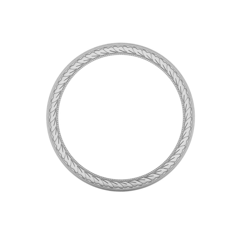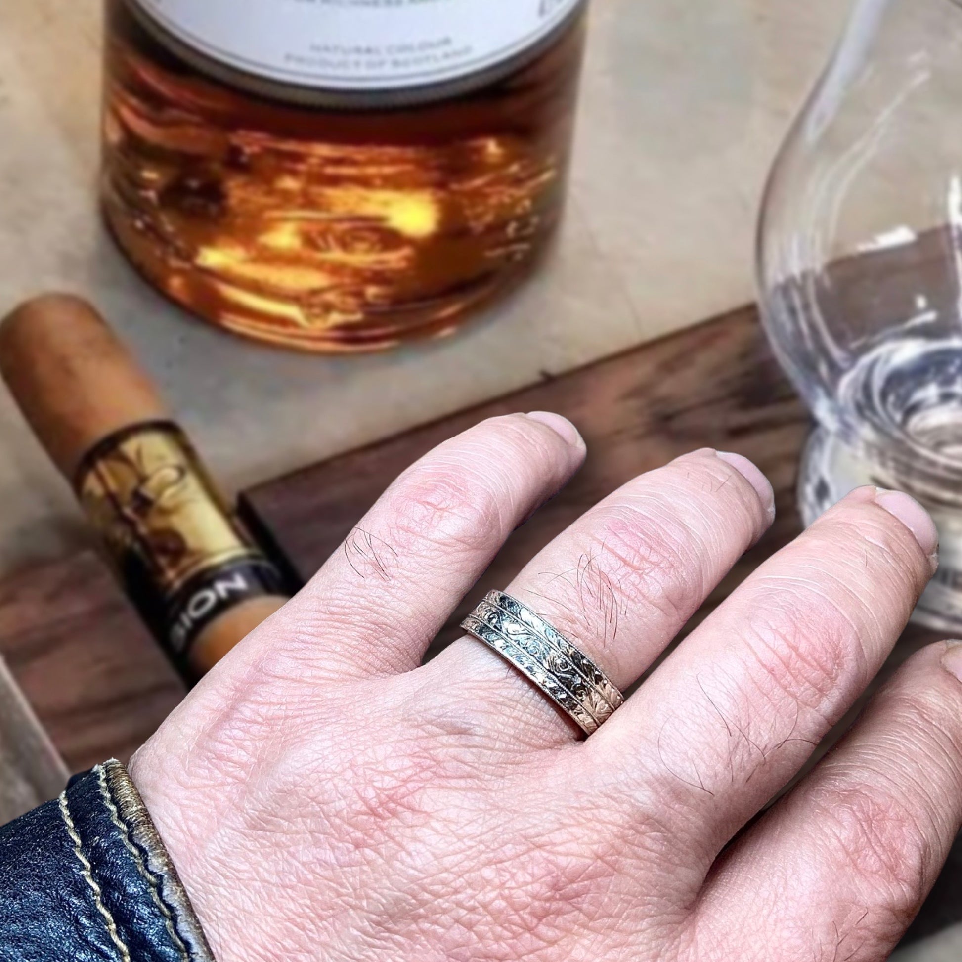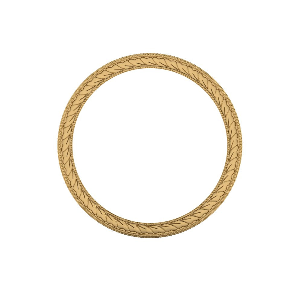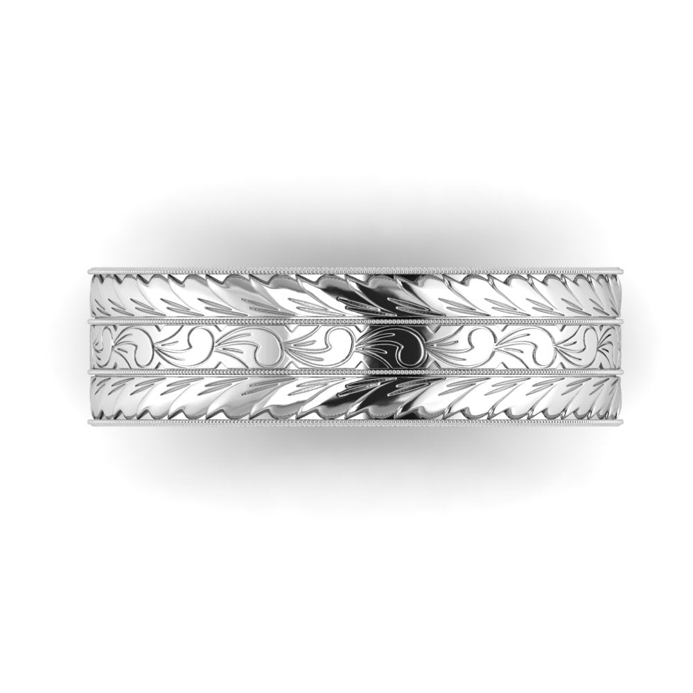 The MΛGNΛ ring embodies a traditional yet timeless design. Hand-engraved with scrolls in the middle symbolizing life's journey, and wheat pattern, traditionally a symbol of abundance, fertility, and prosperity. As a wedding band, this ring would symbolize enduring commitment with its intricate and timeless patterns. As an anniversary ring, it represents the growth and prosperity of the relationship over years, symbolizing the harvest of love and life together. The craftsmanship involved would make this ring a one-of-a-kind heirloom piece.