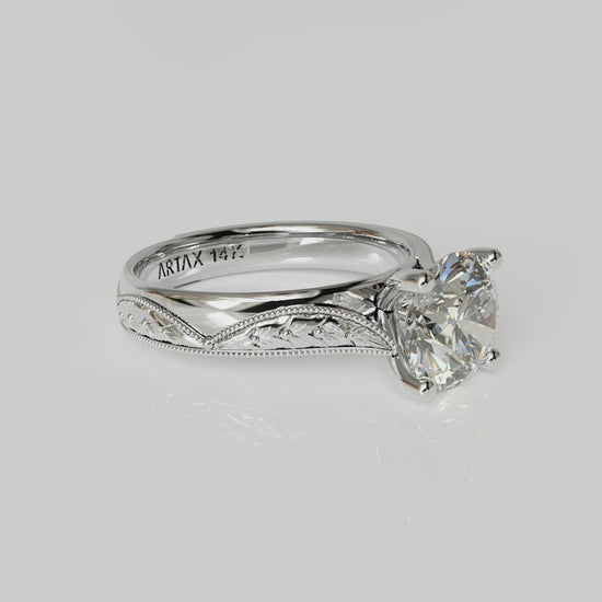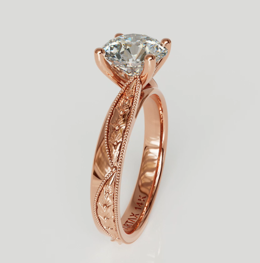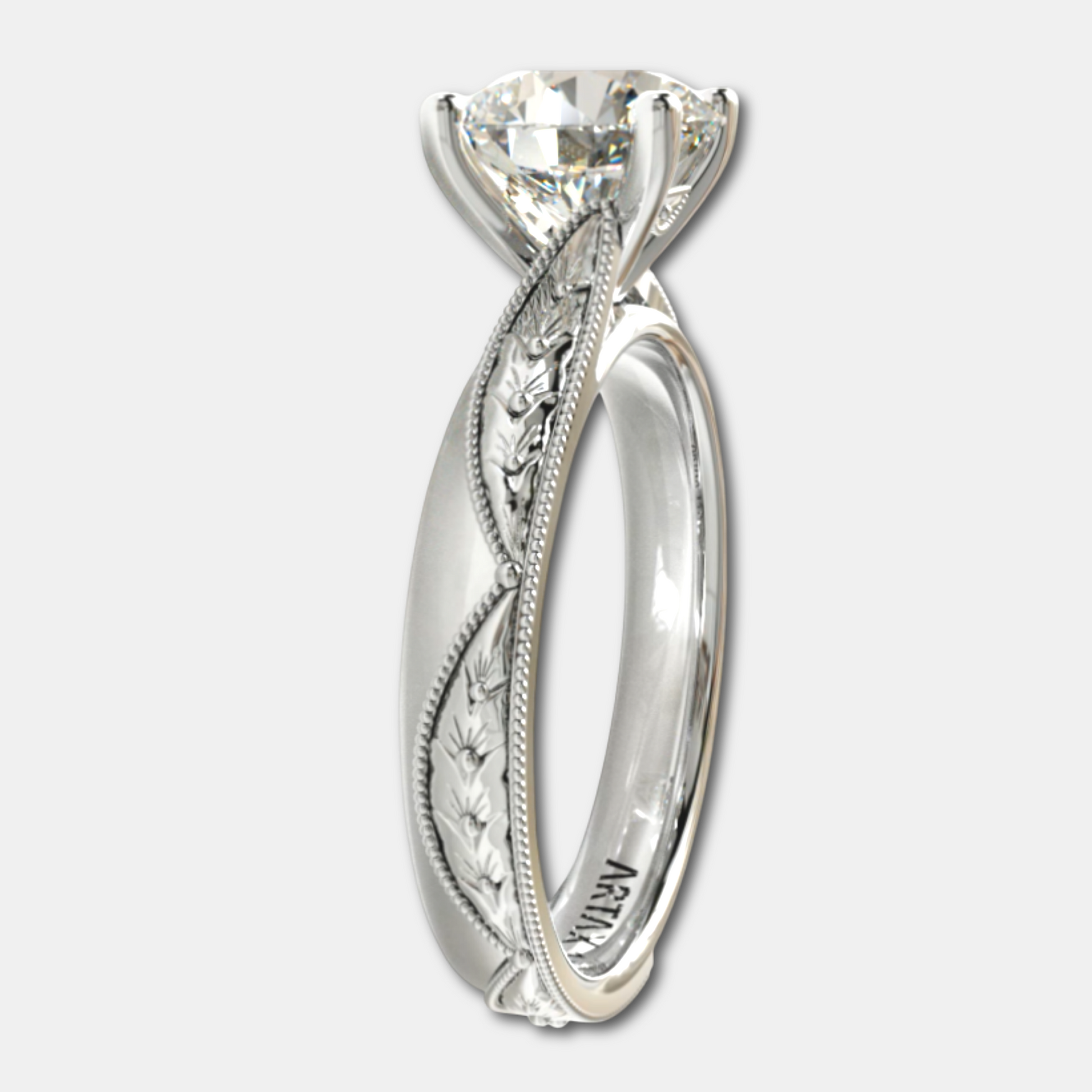 Exquisite Verona-Inspired Hand-Engraved Diamond Engagement Ring: Timeless Romance and Artisanal Craftsmanship. This stunning engagement ring showcases intricate wheat pattern hand-carving, with elegant waves seamlessly connected by delicate, meticulously crafted little balls, embodying timeless artistry and sophisticated design.